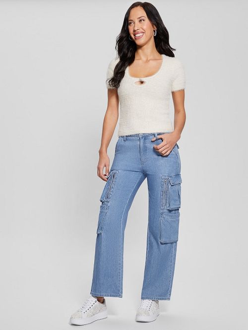 Knit fuzzy yarn sweaterChest cutout with rhinestone-embellished bow accentScoop necklineShort sleevesCropped silhouette70% Nylon, 17% Rayon, 11% Polyester, 2% Metallic Fiber