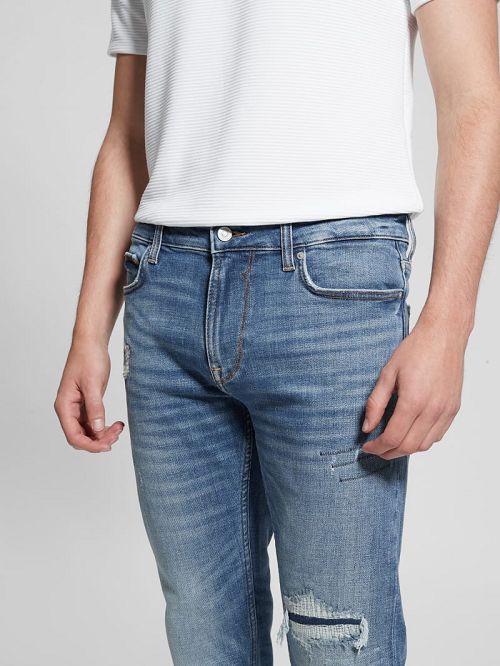 Stretch denim jeansMedium rise, sits at hipsRelaxed fit and straight legMedium indigo denim wash with intentional distress and fadingFive-pocket construction16" leg opening. 32" inseam. Measurement taken from a size 32.Zip fly closure73% Cotton, 20% Recycled Cotton, 5% Elastomultiester/Elasterell-P, 2% Elastane/Spandex. Contains recycled cotton fiber.Machine wash