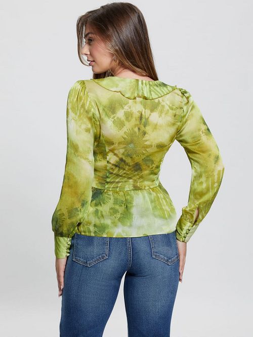 Semi-sheer crinkled chiffon topAllover tie-dye patternPlunging V-neckline with ruffle trim and collarLong sleeves with button cuffsTulip hemButton-front closureWoven60% Recycled Polyester, 40% Polyester. Made with recycled bottles.Machine wash