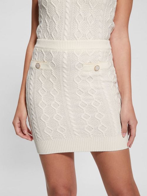 Knit sweater skirtCable-knit constructionElastic waistbandBodycon fit. Mini length.Slips onMother of pearl buttoned welt pocketsHigh rise, sits at natural waistCenter waist to hem: 17"Measurements taken from a size S50% Organic Cotton, 45% Polyamide/Nylon, 5% Wool. Contains organic cotton fibers.
