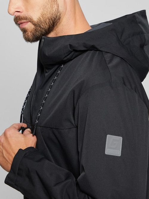 Coated woven jacketAttached hood with reflective drawstringSignature silicone logo patch at wearer's armLong sleeves with adjustable Velcro straps at cuffsSide zip pocketsFront zip closureInner logo patch100% Polyester