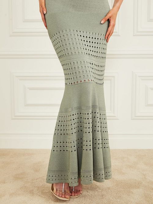 Knit maxi skirtTextured constructionBodycon skirtFlared hemPull-on style with elastic waistPartially linedCenter back to hem: 40.5"Measurement taken from a size M84% Viscose/Rayon, 13% Polyamide/Nylon, 3% Elastane/Spandex