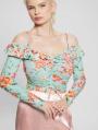 Off-the-shoulder crop topAllover floral printRuched design at frontRuffled trimAdjustable strapsLong sleeves57% Organic Cotton, 38% TENCEL™ Modal, 5% Elastane/Spandex. Contains eco-responsible wood-based fiber.