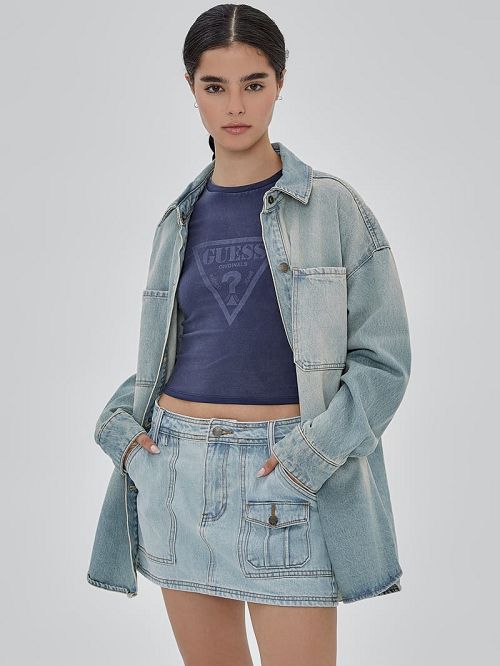 Washed denim topLight-wash denim with abrasion detailEmbroidered signature logo at backCrew necklineLong sleeves with snap closures at cuffsDual slip pockets at chestButton closures at front100% CottonMachine wash