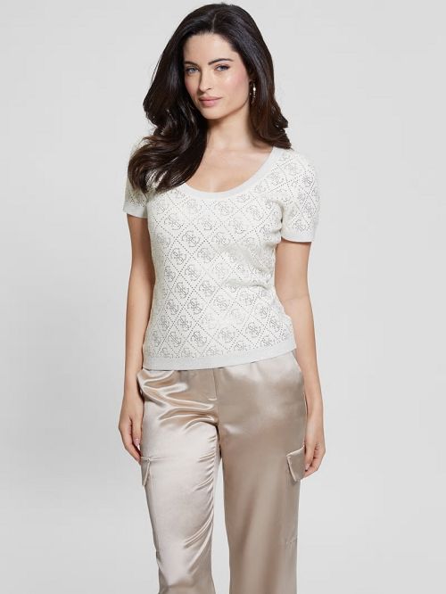 Signature crewneck sweater topAllover Quattro signature encrusted with rhinestonesRibbed trimShort sleeves72% Viscose/Rayon, 28% Polyester