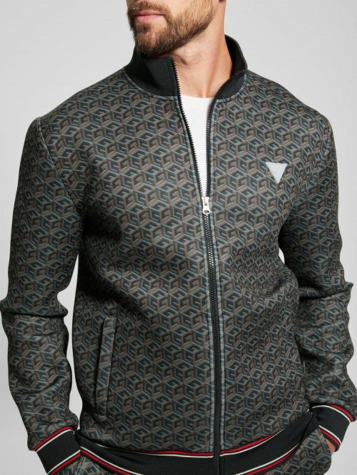 Scuba-knit active jacketAllover signature cube printStanding collarLong sleevesFront pocketsBack signature print with stripesStriped ribbed trimZip-front closureKnit78% Polyester, 15% Rayon, 7% Elastane