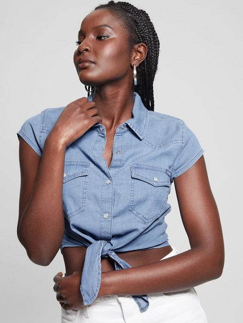 Denim Western crop shirtFolded collarChest pocketsCap sleevesWestern yokeTie-front hemSnap-front closureWoven63% TENCEL™ Lyocell, 35% Cotton, 2% ElastaneMachine wash