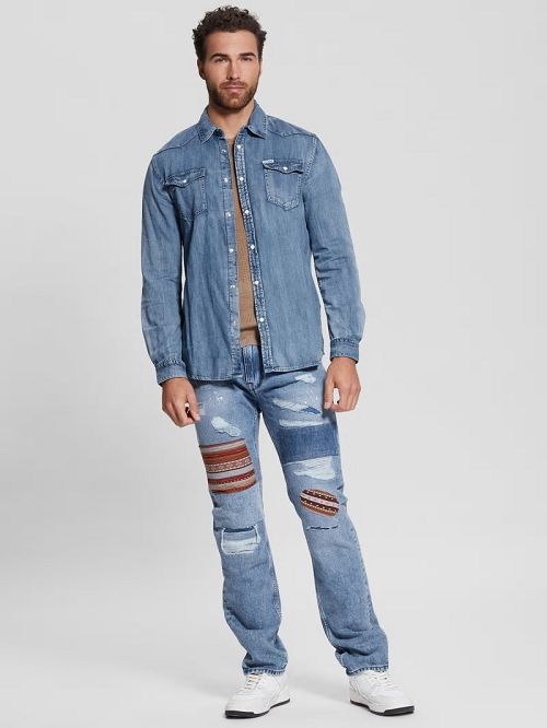Woven denim shirtFolded collarYoke seam-stitching on the shouldersLong sleevesDual chest patch pocketsSlim fitShirttail hemFront snap-button closures100% CottonMachine wash