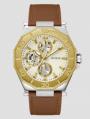Two-tone metal and white multifunctional watchSilver-tone caseGold-tone dodecagonal countdown bezelWhite dial with sunburst designMinimal gold-tone hour markersMultifunctional day, date, and 24-hour international time subdialsBrown genuine leather strapPilot buckle closureCase diameter in mm: 46Water resistant up to 50 m/160 ft2 year limited warranty