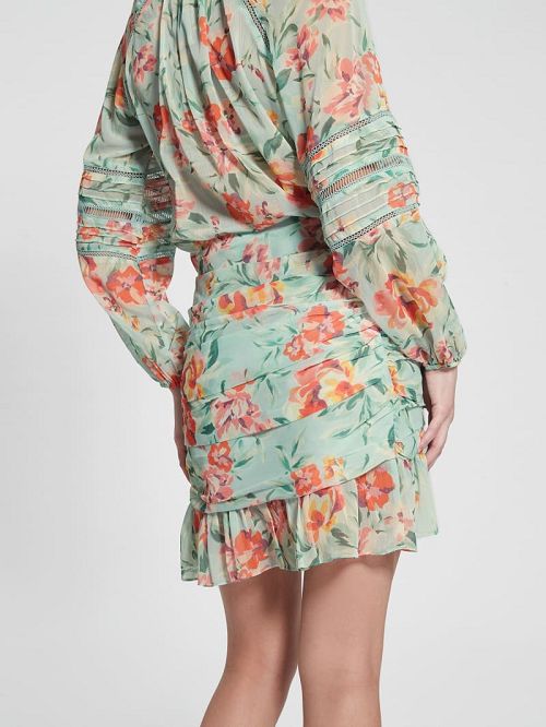 Woven crinkle chiffon mini skirtRuched-pleat fabricationAllover printFront waistband metallic monogram charmAsymmetrical frill hemConcealed zip closureWaist to hem: 19"Measurement taken from a size S52% Polyester, 48% Recycled Polyester. Contains recycled plastic.